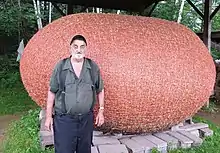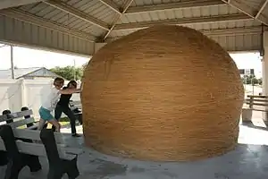 In Lake Nebagamon, Wisconsin, James Frank Kotera created the heaviest ball of twine ever built. Kotera, known by his initials "JFK," started working on the ball in 1979 and continued until his death in January 2023.[8] The weight of the ball, 24,160 pounds (10,960 kg), was estimated by measuring the weight of each bag of twine. The ball is housed in an open-air enclosure in Kotera's lawn; since Kotera's death, the town has fundraised to move it to the town hall.[8] The ball has a smaller companion, "Junior", that is made of string.[7][9]