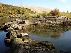 The structure includes a diversion dam extending at an angle into the river to divert water through the headgate into a canal flowing parallel to the river. The headgate structure was built of dressed local limestone, and is 35 feet (11 m) wide, allowing a designed flow of 720 cubic feet (20,000 L) of water per second. Five iron gates controlled the flow. The headgate structure is intermittently inundated by water held in the Yellowtail Dam Afterbay reservoir.[4]