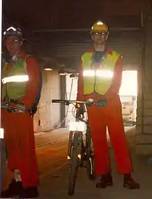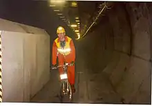 In November 1993, journalists Nick Dutton-Taylor and Damon Brown used the same Saracen bicycles as other construction workers to cycle into the tunnel for an article in Mountain Biking UK.[2][5][6][7][8] They were trained and accompanied by the cycling trainer Clive, but not allowed to go the full way through.[2]