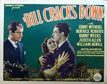 Bill Cracks Down is a 1937 American action romantic drama film directed by William Nigh and starring Grant Withers, Beatrice Roberts, Ranny Weeks and Judith Allen. It was produced and distributed by Republic Pictures. The film was released under the alternative title Men of Steel in the United Kingdom.[1]