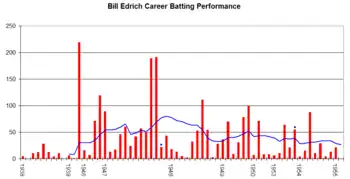 All told, Edrich played in 571 first-class matches between 1934 and 1958, scoring 36,985 runs, with a highest score of 267 not out. His run total puts him 29th on the all-time lists. He scored 2,440 runs for England in his 39 Test matches, with the 219 not out at Durban his best.[2] A professional before the Second World War, he turned amateur afterwards and captained Middlesex jointly with Compton in 1951 and 1952, continuing in sole charge from 1953 to 1957. After retiring from Middlesex, he returned to Norfolk and played Minor County cricket until he was 56, captaining the county until 1971.[2]