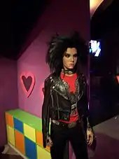 German site dw-world.com says that Kaulitz's look, young age and edgy hairstyle has helped him obtain icon status among many teenage girls.[23] Der Spiegel reports that Kaulitz is an icon within the LGBT community, which Kaulitz has embraced.[19] Kaulitz designs many of his own stage costumes, and despite poor drawing skills, the designs are constructed by his tailor.[24] The singer apparently collects suspenders, and is also "totally crazy about jackets". Kaulitz reports he has hundreds of jackets in his closet – though he has said that none of his jackets are real leather as he is opposed to using animal pelts/feathers for clothing.[24] He cites his fashion and style influences as David Bowie (particularly in the 1986 film Labyrinth), Nena, Vampires, Paris' secondhand shops, striking jewelry and Dior Homme.[24] He also cites Steven Tyler, Karl Lagerfeld and Hedi Slimane.