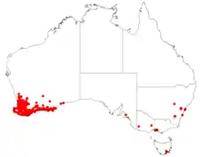 Australian bluebell was originally endemic to the south-west of Western Australia where it grew in coastal and mallee heath in the Avon Wheatbelt, Coolgardie, Esperance Plains, Jarrah Forest, Mallee, Swan Coastal Plain and Warren bioregions.[2] Horticultural use in other states, espcially of the white and pink forms of the species, has allowed the species to be naturalised in other states, but the species does not appear to be as weedy as the similar B. heterophylla.[3]