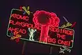 Didy Wah Didy is named for the last stop on a mythical railroad bound for hell (Black Southern American folklore.) With simple imagery and few words the piece is a timed neon sequence that shows a mushroom cloud forming (animated) over a boy's head. With the words "Atomic Playground Ahead" and "Kids Ride the Big One!" it is a piercing send-up of typical American roadside attractions. In three of the four corners, constantly flashing are the words "chills," "spills" and "thrills." When the "kid", who starts out smiling, then becomes alarmed, is finally "nuked," "death" with an alternating skull and crossbones flashes in the lower right hand corner. The three flashing words are surrounded by the icons common in Lawless' work, thunderbolts, dollar signs and stars. The display takes about 60 seconds to complete its sequence.