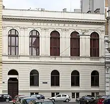 An attic style balustrade is arranged on the entire length of the building above the profiled ledge. The balustrade was originally decorated with statues of Apollo, Asklepios, Hygieia and Minerva, made of Loretto stone by the sculptor Anton Pavel Wagner. Beyond a curved entry hall a wooden door with original corroded discs grants access to the building. Another similar door straight ahead leads to the yard, and to the right a stair with handrails between two marble columns leads to a spacious foyer on the elevated ground floor. The foyer and the vestibule are equipped with terrazzo floors. The original porter's lodge is located to the left of the entry hall and behind it, in the backyard section of the building, is a meeting room with old wooden furniture.[2] A richly ornamented niche in the vestibule shows a bust of Emperor Franz Joseph I and on its side walls, a votive table reveals some facts concerning the construction.[4][5]