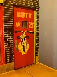 Another sign reads: "Cheezborger, Cheezborger, Cheezborger. No Pepsi. Coke," These words, with Pepsi and Coke in reverse order, were originally popularized by John Belushi in "Olympia Cafe," an early Saturday Night Live sketch that was inspired by the tavern.[7] Bill Murray and sketch writer (and bit player) Don Novello were regulars at the Billy Goat; Belushi and Murray were natives of the Chicago area, and Novello had moved to Chicago in the 1960s.