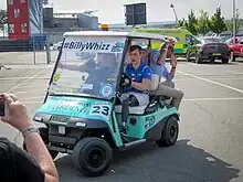 Monger driving a golf buggy with "#BillyWhizz" sticker in July 2018, over one year post-crash