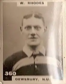 William Rhodes (birth unknown – death unknown) was an English professional rugby league footballer who played in the 1910s and 1920s, and coached in the 1920s through to the 1950s. He played at representative level for England, and at club level for Dewsbury (two spells), as a wing, and later as a prop, i.e. number 2 or 5, or, 8 or 10,[1] and coached at club level for Castleford.[4]