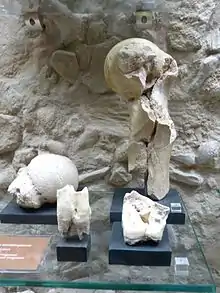 In 1974 a piece of a human skull was identified among the finds. To date, 37 human bones and teeth have been found, mainly parts of the skull. They represent the remains of at least three individuals and have been classified as Homo erectus bilzingslebenensis by Emanuel Vlcek (Prague). The remains of the skulls show that they have been intentionally smashed postmortem, maybe as part of a burial rite.