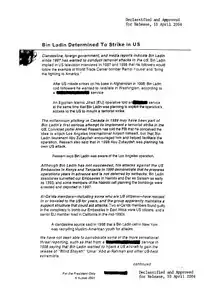 The PDB was declassified and approved for release to the 9/11 Commission on April 10, 2004, and was included in the commission's 9/11 Commission Report, published on July 22, 2004.[6] According to the National Security Archive, President Bush was the first sitting president to release a PDB to the public.[1]