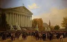 In January 1871, Louis Alfred Binant,[1] a Parisian dealer in paintings, artists' paper, crayons, paintings and other artists' materials with shops on rue de Cléry and boulevard Rochechouart (now boulevard Marguerite-de-Rochechouart),[2] commissioned thirteen artists to produce 36 large-format oil on canvas paintings "certainly made two metres by four" to document the 1870-1871 siege of Paris. According to him, he also wanted "[to make] a work of memory, for neither books (however well-informed), nor engravings can speak to the eyes and therefore to the spirit as clearly as a painting". The paintings were exhibited from November 1871 to February 1872 at Durand-Ruel's dealership on rue Le Peletier,[3] with the exhibition entitled Le Siège de Paris 1870-71. Exposition des peintures des épisodes civils et militaires de la défense. In September 1898, Binant bequeathed all 36 paintings and a booklet describing each painting to the city of Paris, though only thirteen still survive, all at the musée Carnavalet, which they officially entered in February 1914. The other works (now lost) remained in the stores of the Petit Palais, where they may have been destroyed during the German occupation (1940-1944).[3][4][5]