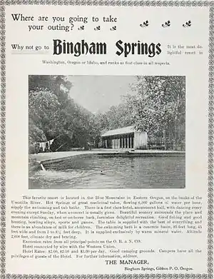 Bingham Springs was a station and tollgate on the Thomas and Ruckle stagecoach line through the Blue Mountains.[3] The stage house was built in 1864.[3] Alfred B. Meacham operated the station from 1867 to 1868.[3] There was a post office at the locale named "Purdy" from 1881 until 1891, named after one of the early owners of the stage house.[3] Later, the community had a Gibbon mailing address, and today it receives its mail through Adams.