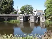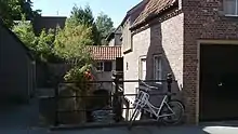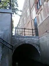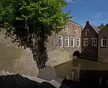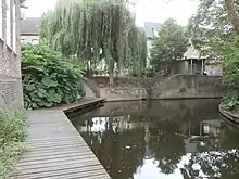 The Kerkstroom is named for flowing under the choir of St. Catherine's Church. It is a short natural stream that exits into the Kleine Vughterstroom.[12] From the city moat there are two entrances to the Kerkstroom. Both are called Kruisbroedershekel. The old Kruisbroedershekel was rather narrow, but nevertheless required a 'Hekel' to close it. It was only in 1880 that it was transformed into a sluice. The new Kruisbroedershekel dates from 2002, and was made to (again?) give boats access to the Kerkstroom. From a low hole in the wall west of the old Hekel, a corridor starts through the walls. Inside a room was made which shows the fourteenth-century second city wall and a 16th-century gate which was found during construction.[13] The corridor continues to exit in the Kerkstroom just behind the wall.