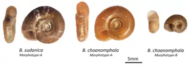 However, upon further analysis of the African Biomphalaria species found B. sudanica is a part of the "Nilotic Species Complex" and is more closely related to B. alexandrina, B. smithi and B. stanleyi, than the previously thought, B. choanomphala.[6]