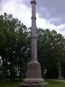 In the summer of 1894, the commission raised a 46-foot (14 m) granite monument of conventional design on the former fairgrounds. At the dedication ceremony of the Birch Coulee State Monument on September 3, 1894, former governor William Rainey Marshall lambasted the commission in his speech, criticizing both the incorrect location of the monument and its inscriptions as falsifying history.[9][8]