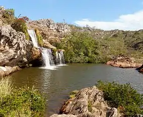 The park is in the Serra do Espinhaço, a range with quartz rocks in the Jequitinhonha River basin. Altitudes range from 720 metres (2,360 ft) in the north to 1,480 metres (4,860 ft) in the south.[3] The park still has traces of gold and diamond exploration. There are archaeological sites with rock inscriptions, but their locations are not marked.[3]