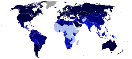 Human Development Index map. Darker is higher. Countries with a higher HDI usually have a lower birth rate, known as the fertility-income paradox.