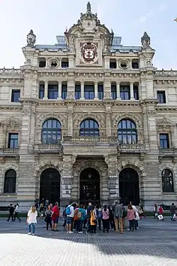 The Bizkaia Delegation Palace is an eclectic mansion in the Ensanche area of Bilbao, Spain. It's the seat of the executive branch of Government of Biscay, the legislative assembly meets in Gernika. The Biscay Palace of the Foral Deputation (also known as simply The Foral Palace), located at 25 Gran Vía, Bilbao, is a free-standing rectangular building, of solid and majestic appearance. Designed by the architect Luis Aladrén Mendivil, it is considered “a pinnacle work of Alfonsine eclecticism” in Vizcaya. It was built between 1890 and 1900 by the Gran Vía de Don Diego López de Haro avenue.