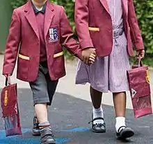 - Girls - maroon blazer, white blouse navy jumper/cardigan plaid skirt/pinafore. Or grey trousers maroon tie white blouse and navy jumper/ cardigan