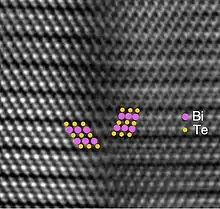 Bismuth telluride is a narrow-gap layered semiconductor with a trigonal unit cell. The valence and conduction band structure can be described as a many-ellipsoidal model with 6 constant-energy ellipsoids that are centered on the reflection planes.[4] Bi2Te3 cleaves easily along the trigonal axis due to Van der Waals bonding between neighboring tellurium atoms. Due to this, bismuth-telluride-based materials used for power generation or cooling applications must be polycrystalline. Furthermore, the Seebeck coefficient of bulk Bi2Te3 becomes compensated around room temperature, forcing the materials used in power-generation devices to be an alloy of bismuth, antimony, tellurium, and selenium.[5]