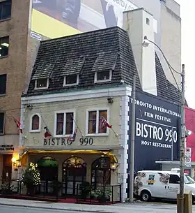 The restaurant was a popular Toronto eatery for actors and other celebrities.[5] It was located on Bay Street near Wellesley, just opposite the elite Sutton Place Hotel, and near most of Toronto's other luxury hotels.[6] This district was also the centre of the annual Toronto International Film Festival for years. The Bistro had thus become popular among visiting celebrities.[7]