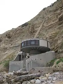 "Mushroom House" on south end of Black's Beach, north of Scripps Pier with funicular to La Jolla Farms mansion atop cliff