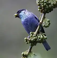 Different tanager species can feed together in the same flock without competing for arthropods as they each feed at specific heights, on different parts of the tree with unique positions and movements.[11] The black-capped tanager mainly forages for insects in low shrubs and in trees, staying close to the trunk, on branches that are either bare or covered in moss.[12] This bird also eats fruits such as whole berries and cecropia fruit.[9]