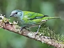 The black-capped tanager is approximately 13 centimetres (5 in) long, and weighs between 18 and 20 grams.[3][4] The bird's iris is dark brown, while the beak and legs are black. The male of the species has a black crown, with the black extending to the lores, forehead, and upper nape. Its upper-parts are a shining silvery bluish-grey, which extends to the upper tail coverts, and contrasts sharply with the black crown. The upperwing-coverts are a duller bluish-grey, with an edging of duller blue, whereas the primary coverts are black, with a dull blue edge paler than that of the wing coverts. The tertial feathers are also black with a blue outer edge. The throat, the sides of the neck, the sides of the head till the eye, and the chest are a shining aquamarine-green or opalescent green. The feathers are lanceolate, or spear-shaped. Their black bases are thus visible, giving this area of the bird a streaked or scaly appearance, which is especially visible on the chest.[3][4] The rest of the underparts are a dull and uniform greyish-blue, with the exception of the undertail-coverts: these feathers have dark centers and broad, white edges.[3][4]