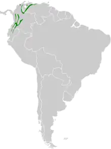 Black-capped tanagers are found in tropical moist montane forests in northern Ecuador, Colombia, and Venezuela.[1][9] The species is found at the edges of subtropical forest, secondary woodland, and trees and bushes in nearby open spaces, although it is locally uncommon.[4][10] Its elevational range is variously described as being between 1,300 and 2,200 metres (4,300 and 7,200 ft),[1] and between 1,000 and 2,800 metres (3,300 and 9,200 ft) above sea level, although most records occur between 1,500 and 2,200 metres (4,900 and 7,200 ft). An isolated record exists from 700 metres (2,300 ft) above sea level.[4] It is found in the Colombian, Venezuelan, Ecuadoran, and Peruvian Andes, including in the Sierra de Perijá, and also in the Santa Marta mountains in Colombia. Within Ecuador, it was first recorded on the western slopes of the Andes only in 1980, leading researchers to suggest it may have expanded its range as a result of deforestation.[10]