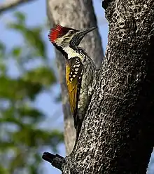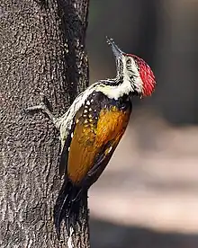 The black-rumped flameback (Dinopium benghalense), also known as the lesser golden-backed woodpecker or lesser goldenback, is a woodpecker found widely distributed in the Indian subcontinent.[2] It is one of the few woodpeckers that are seen in urban areas. It has a characteristic rattling-whinnying call and an undulating flight. It is the only golden-backed woodpecker with a black throat and a black rump.