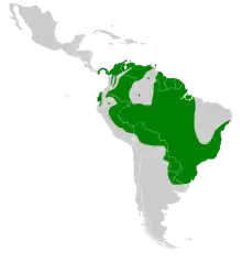 The nominate subspecies of the black-throated mango is found from western Panama into much of Colombia and Venezuela, the Guianas, eastern Ecuador and Peru, northern and eastern Bolivia, eastern Paraguay, far northern Argentina, most of Brazil, and on both Trinidad and Tobago.[3][6] It has also occurred as a vagrant in Uruguay.[5] Subspecies A. n. iridescens is found in extreme southwestern Colombia, western Ecuador, and extreme northwestern Peru.[3][7][6]
