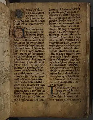 The Black Book of Basingwerk (Welsh: Llyfr Du Basing) is an illuminated manuscript in the National Library of Wales (NLW MS 7006D) containing, among other texts, a Welsh translation of Geoffrey of Monmouth's Historia Regum Britanniae.[1] It is mostly the work of the Welsh poet and scribe Gutun Owain (fl. 1460–1500). The illumination is limited to three decorated initials, and two marginal drawings now barely visible to the naked eye.