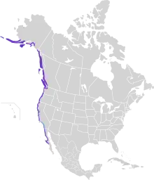 The black oystercatcher (Haematopus bachmani) is a conspicuous black bird found on the shoreline of western North America, ranging from the Aleutian Islands of Alaska to the coast of the Baja California peninsula.