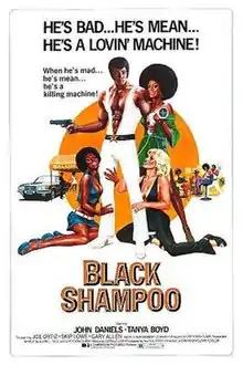 Black Shampoo is an American exploitation film directed by Greydon Clark. Released in 1976, the comedy film is considered an example of the blaxploitation and sexploitation subgenres of exploitation film. Produced on a budget of $50,000,[1] the film stars John Daniels as Jonathan Knight, an African American businessman and hairdresser who frequently has sex with his predominantly white female clients, and Tanya Boyd as Brenda, Jonathan's secretary and girlfriend, who was previously in a relationship with a white mob boss, who, out of jealousy towards his ex's new lover, begins to regularly send goons to trash Jonathan's hair salon.[2] The violence escalates as the film progresses.
