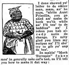 Aunt Priscilla's Recipes was a food and recipe column published in the Baltimore Sun during the 1930s. Aunt Priscilla was a mammy caricature who was the stereotypical good southern cook who spoke in a broken and exaggerated dialect. The alias of Aunt Priscilla was actually a white woman named Eleanor Purcell. Purcell also released several cookbooks under the alias.[15] Purcell also took up the person of Aunt Ada in a column for The Evening Sun named "Ask Aunt Ada". Black women were often the faces of these food or housekeeping columns because of the stereotypes like the mammy which associated them with servant and domestic roles.[16]
