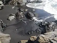 When lava contacts water, it cools rapidly and shatters into sand and fragmented debris of various size. Much of the debris is small enough to be considered sand. A large lava flow entering an ocean may produce enough basalt fragments to build a new black sand beach almost overnight. The famous "black sand" beaches of Hawaii, such as Punaluʻu Beach and Kehena Beach, were created virtually instantaneously by the violent interaction between hot lava and sea water.[2] Since a black sand beach is made by a lava flow in a one time event, they tend to be rather short lived since sands do not get replenished if currents or storms wash sand into deeper water. For this reason, the state of Hawaii has made it illegal to remove black sand from its beaches. Further, a black sand beach is vulnerable to being inundated by future lava flows, as was the case for Hawaiʻi's Kaimū, usually known simply as Black Sand Beach, and Kalapana beaches.[3] An even shorter-lived black sand beach was Kamoamoa.[4] Unlike with white and green sand beaches, walking barefoot on black sand can result in burns, as the black sand absorbs more solar radiation.[5]