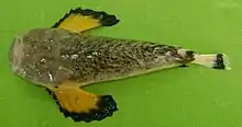 The blackfin stonefish has 15 to 17 spines and 4 to 6 soft rays in its dorsal fin, typical counts being 16 spines and 4 soft rays. There are 3 spines and 7 or 8 soft spines in the anal fin, 14-15 fin rays in the pectoral fin and a single spine and 5 soft rays in the pelvic fins. All the fin rays are simple and are not branched. The head is depressed with an upwards pointing mouth and upward pointing eyes on the head’s dorsal surface. There are no deep pis on the head. The body is greyish brown mottled with pale. The dorsal fin is dark while the caudal fin is pale with a black submarginal band. The anal, pelvic and pectoral fins have yellow bases and wide black distal bands.[6] This species reaches a maximum total length of 13 cm (5.1 in).[7]