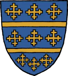 Blackham of London Coat of Arms; Azure, two bars between nine cross crosslets. 3. 3. 3. Or. [1]