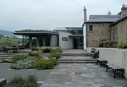 Extant buildings from the early industrial period include Ty-Mawr (Big House) also known as Blaenavon House, built for Iron Master, Samuel Hopkins, in 1791, worker's housing terraces, St. Peter's Church (1804), St. Peter's School (1816) and the Blaenavon Workmen's Hall (1894).[2] Other elements of the Industrial Landscape are the mines and quarries from which coal, iron ore, fire clay and limestone were extracted.[2] There are traces of horse-drawn railways, tunnels and inclines that were used to carry iron ore, coal and limestone to the ironworks, and to carry pig iron to the Garnddyrys Forge. Wrought iron was taken from the forge to Llanfoist on the Brecknock and Abergavenny Canal for transport to other parts of Britain and the world. There are walks and trails along which visitors may explore the Landscape.[1] Waymarked footpaths follow the tracks of the earliest iron railways.[3] The Pontypool and Blaenavon Railway was once an important transport facility. The steam railway has been restored and has a station in the centre of the town.[5]