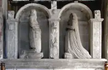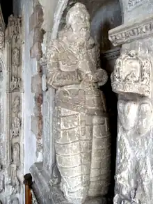Sir William Kirkham (died 1623), nephew, son of Richard Kirkham of Pinhoe in Devon by his wife Agnes Cape of Somerset.[11] He married (as his second wife) Mary Tichbourne (died 1627), a daughter of Peter Tichbourne of Hampshire[11] and a sister of Chidiock Tichbourne (1562-1586), a conspirator and poet. By Mary he had 8 sons and 4 daughters, the second son being Francis Kirkham who married the heiress of Roope of Bidwell, Newton St Cyres, and founded the line of Kirkham of Bidwell. His kneeling effigy, dressed in armour with neck-ruff and bareheaded, survives in the Kirkham Chantry, facing that of his wife.[26] Between the figures is a column on which is sculpted at top a sunburst inscribed with the letters "IHS" below which is inscribed "SPES ET" ("hope and"), below which is a crown, the browband of which is inscribed "CORONA" ("crown"), below which is a pair of hearts overlapping. At the base of the central column is a heraldic shield sculpted with six quarters, apparently not in its original position. The two outermost columns are each decorated with four heraldic shields, seven of which have been chiselled flat and unintelligible. The only arms still visible are on the top left shield, showing Kirkham impaling a field vair, but with the chief chiselled flat. On top of all three columns is a putto, with wings folded over his chest, but with face features chiselled away. The monument was "covered with plaster" until 1753, when on its removal the following inscription was revealed (since disappeared):[26]