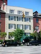 Façade of the original Blair House during the state visit of Queen Elizabeth II of the United Kingdom in 2007. The Royal Standard of the United Kingdom is flying from the flagpole.