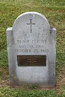 In 1980, Lee was appointed to the University of Maryland, College Park Board of Regents, where he served until his death from cancer at his home in Silver Spring on October 25, 1985.[1] After his death, commentators remarked that Lee was an able governor, but a modest politician who was not comfortable working in crowds and did not adequately distance himself from the corruption of Mandel and Mandel's predecessor, Spiro Agnew.[1] Lee was also damaged by family troubles, which included the suicide of one of his sons in 1973.[1] Nevertheless, Lee was praised by the media for his eloquence, honesty, and capable administrative skills.[1][4][6] He is buried in Rock Creek Cemetery in Washington, D.C.[3]