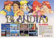 Blandia (ブランディア, Burandia) is a weapons-based versus fighting game developed and released into video arcades by Allumer in 1992. It is the sequel to Allumer's Gladiator. Along with Strata's Time Killers, Blandia is one of the earliest weapon-based fighting games modeled on the success of Capcom's Street Fighter II, a subgenre later typified by SNK's Samurai Shodown and The Last Blade.