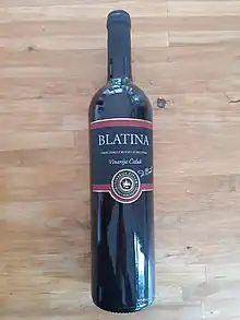 Blatina (Cyrillic: Блатина) is red wine grape variety primarily grown in the Herzegovina region of Bosnia and Herzegovina. It has a functional female flower (auto-sterile), and for that reason it is always cultivated in plantations with other varieties such as Alicante bouschet (Kambuša), Merlot, and Trnjak, which at the same time pollinate Blatina. During the period of insemination, because of the rain, it can fail in giving fruits, and it is then called "praznobačva" (empty barrel). Blatina can produce dry red wine with 12 to 13.5% of alcohol, 5 to 7 g/L of total acidity, 25-32 g/L of extract. It has a dark ruby red color.