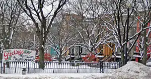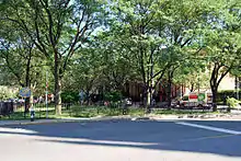 Bleecker Park is a small .37-acre (0.15 ha) urban park in Albany, New York. The park is triangle-shaped, bounded by Madison Place to the south, Madison Avenue to the north, and Eagle Street to the west. The Cathedral of Immaculate Conception is across Eagle Street from the park, while Madison Place, which is only one block-long, consists of rowhouses primarily in High Gothic and Italianate architecture, built in the mid-to-late-19th century.[1] Across from the park on Madison Street is the Empire State Plaza East Parking Garage, built in 1999/2000.[2] The park features the oldest fountain in the city which is surrounded by a small circular garden, two circular beds are also in the park and each feature a shrub surrounded flowers, these small gardens make Bleecker Park "a most charming and restrained Victorian public garden" according to an article in the Albany Times Union.[3]