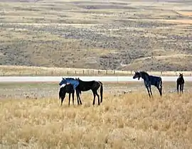 The Bleu Horses is a set of 39 horse sculptures made primarily of steel and permanently installed on a hillside off Highway 287 just north of Three Forks, Montana.[1] The name of the installation is taken from a color of horse known as a blue roan, though the live animal color is closer to gray.[2] The horse sculptures were created and set up by artist Jim Dolan of Belgrade, Montana, who previously had created other complex outdoor sculptures over the previous 30 years, including a herd of elk placed upon the lawn of a bank in Bozeman, and a fly fisherman sculpture in Ennis.[3] He also donated four of his sculptures at Montana State University (MSU), and installed a flock of geese in the terminal of Bozeman Yellowstone International Airport.[4]