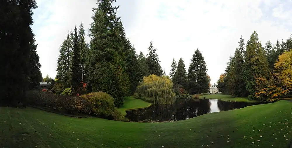 The Bloedel Reserve is a 150-acre (0.6 km2) forest garden on Bainbridge Island, Washington, United States. It was created by Virginia and Prentice Bloedel, the vice-chairman of the lumber company MacMillan Bloedel Limited, under the influence of the conservation movement and Asian philosophy. The couple wished to capture the essence of the Japanese garden—the qualities of naturalness, subtlety, reverence, tranquility—and construct a Western expression of it. Although the Reserve includes a traditional Japanese garden, the Bloedels' approach for the rest of the property stands in contrast to that of 'Japanese gardens' which achieve their effects through the use of ornament. The Bloedel Reserve has both natural and highly landscaped lakes, immaculate lawns, woods, a stone garden[1] (formerly the swimming pool where poet Theodore Roethke drowned in 1963), a moss garden, a rhododendron glen, and a reflection garden designed with the assistance of landscape architects Richard Haag, Thomas Church, Kazimir Wall, and Danielle Stern. The Bloedels' French Chateau-style home, including many original furnishings, is preserved as a visitor center.[2]