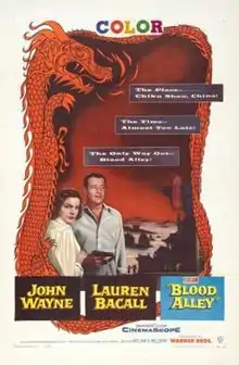 Blood Alley is a 1955 American seafaring Cold War adventure film produced by John Wayne, directed by William A. Wellman, and starring Wayne and Lauren Bacall. The film was distributed by Warner Bros. and shot in CinemaScope and Warnercolor.[2] The film depicts a voyage from Chiku Shan, a village on the Communist Chinese coast, all the way to Hong Kong via the Formosa Strait.[3]