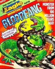Bloodfang is a British comic character, appearing in strips published by IPC Magazines. The character featured in British comic stories published in the weekly anthology Eagle from 9 June 1984 to 30 March 1985, written by John Wagner and Alan Grant and drawn by Jim Baikie, Carlos Cruz-Diez and Vanyo. The story followed the eponymous tyrannosaurus rex, initially in prehistoric times and then later in the year 2150.