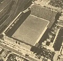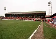 In 1925, a new South Stand was built to provide a new boardroom, offices, dressing rooms, baths and refreshment bars. It cost just over £13,000 and held 4,000 people, bringing the total ground capacity to well over 20,000.[8] Also this year, a new directors' box was built in the North-West Corner of the ground. It was used for the first time for the visit of Southampton on 29 August 1925. Ernest Lawson commented in the Gazette & Herald: "It's a nice box they have placed themselves in; it must be for safety, for it is far enough out of the way! But of what are they frightened?" He offered an answer at a later date: "The Let Me Smoke railway stokers are a choking nuisance. Now we know from what the directors are protecting themselves." He was referring to the smoke that regularly drifted in at the north-west corner of the ground, caused by passing steam trains. Lawson added: "The crowd do, however, have the last laugh when the wind comes in from the east!"[5]